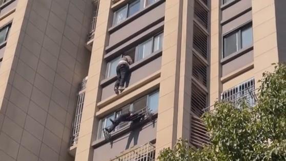 視頻顯示,一名老人仰面被困在一處高樓窗臺外的晾衣架上,一名男子身綁白色帶子,從樓上爬下踩在窗臺,將老人救回屋內。視頻發布者稱,事發南京市浦口區亞東濱江和園小區。