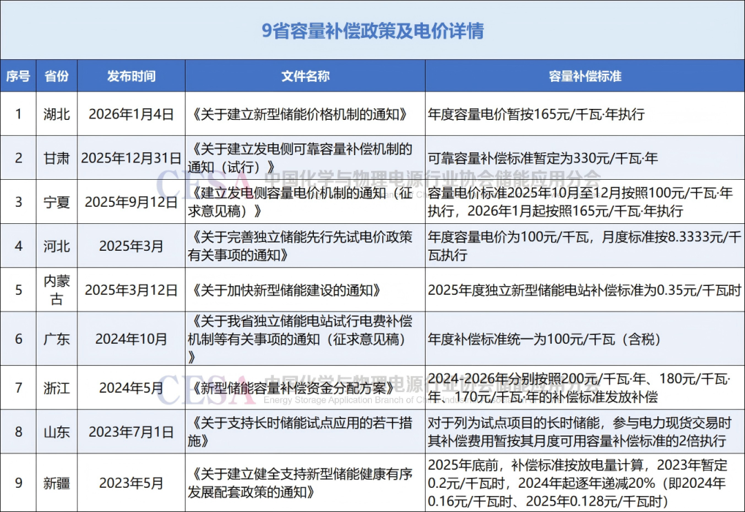 當前,我國正處于從各地探索“容量補償”向全國范圍建立統一、規范的“容量電價”機制過渡的關鍵階段。截至目前,全國已經有包括湖北、甘肅、寧夏等9省公布了電網側獨立儲能容量補償政策及價格標準。